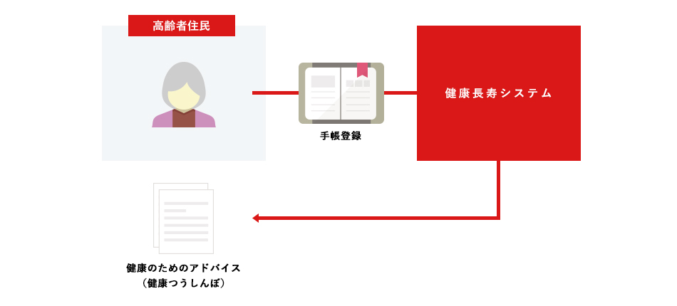 地域住民の暮らしや週間を記録した手帳をもとに健康状態を分析し、健康になるためのアドバイス(つうしんぼ発行)を行うシステムです。